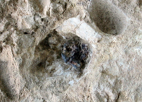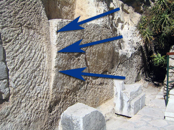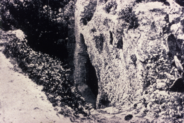 På høyre siden av graven kan man se en jordskjelvsprekk som strekker seg nedover og til siden.