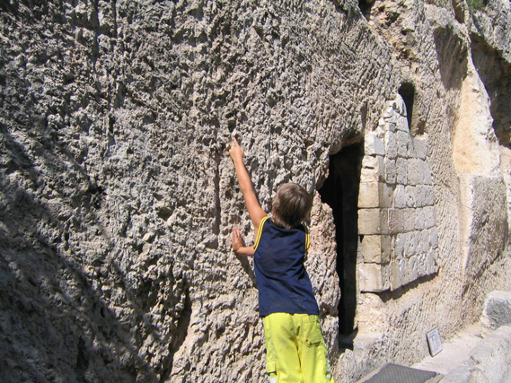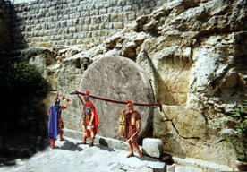 I denne graven som ble funnet i hagen like ved hodeskallestedet kan vi se at den er designet for å bli lukket igjen ved en rullestein.